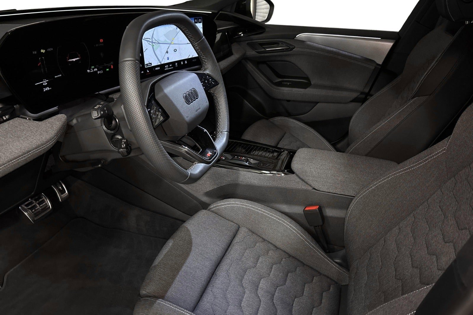 * S-Line selection pakke indeholder : - S-line interiør - Sportssæder i sort stof-kunstlæder-kombination - Loftbeklædning i sort stof - Interiørelementer øverst og nederst i stof - Kontrastflader og betjeningsknapper i sort højglans til elementer - Dekorindlæg i aluminium, mat børstet med prægning i antracit - Sportslæderrat 3 eget med flad top og bund - Pedaler og fodstøtte i ædelstål - Panellister med aluminiumsindlæg foran, med lys, S-logo - Info: Stof i designet Melange er et bæredygtigt materiale, der fremstilles ved hjælp af genanvendte tekstilfibre
